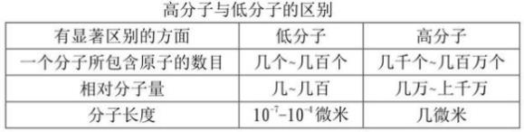 高分子与低分子的明显差别各自反映在下面三个层面:一个分子中所包括的分子数量,分子量,分子长度。